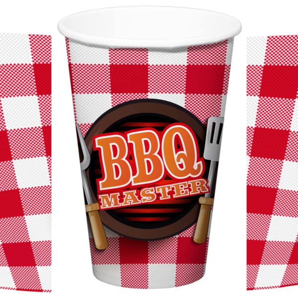 Jednorázové papírové kelímky s nápisem BBQ Master vám usnadní grilování s přáteli a krásně ozdobí zahradní párty v retro americkém stylu.