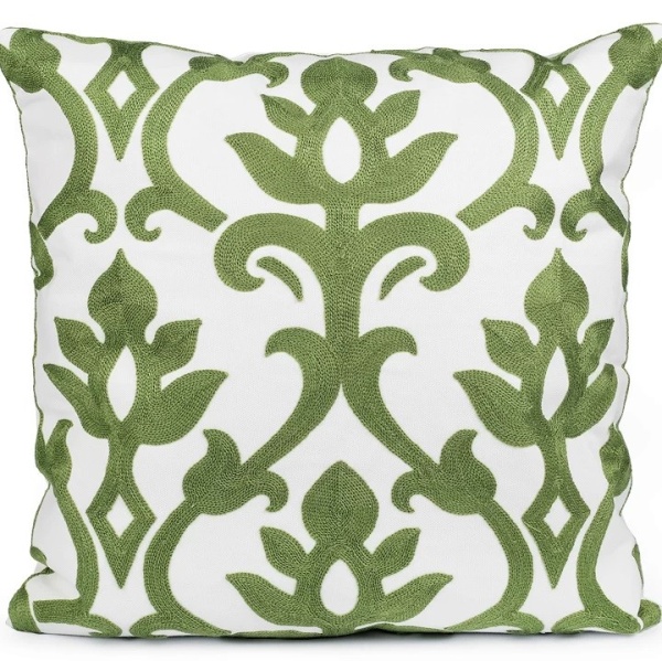 Má pohodlné zapínání na zip. Přední strana polštáře je bílá se zelenými ornamenty, zadní je jednobarevná bílá.