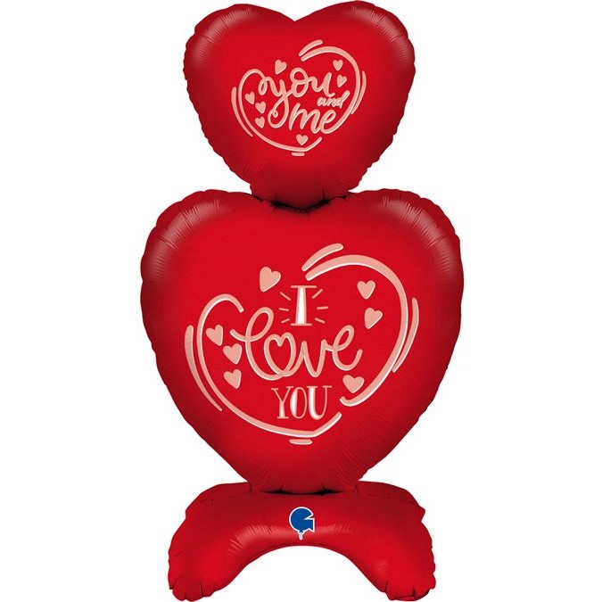 Krásný a velký fóliový samostojný balónek ve tvaru dvou srdcí a nápisem I love you vám nesmí chybět jako výzdoba na Valentýnské, zásnubní, svatební nebo jiné romantické párty pro zamilované.