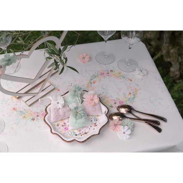 Něžné textilní dekorativní květiny k dekoraci a k ozdobení vašeho narozeninového nebo svatebního stolu.