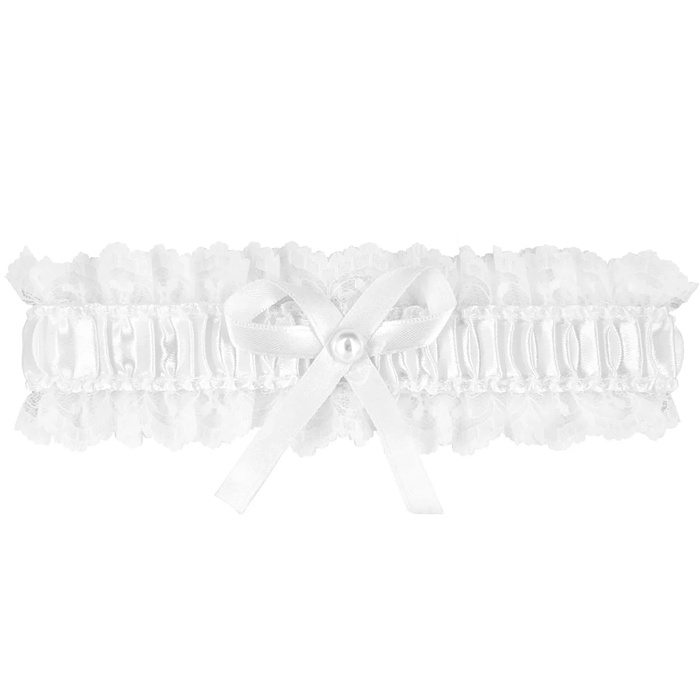 Svatební krajkový bílý podvazek s mašličkou, která je uprostřed ozdobená malou lesklou perlou.