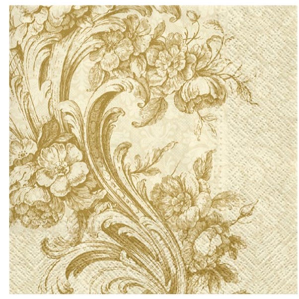 Bohatý ornamentální vzor v béžovo-zlatém tónu se prolíná s detailně zpracovanými květy, které celý motiv zjemňují. Výsledkem je design, který působí slavnostně a vznešeně, ale zároveň si zachovává lehkost a přírodní kouzlo.