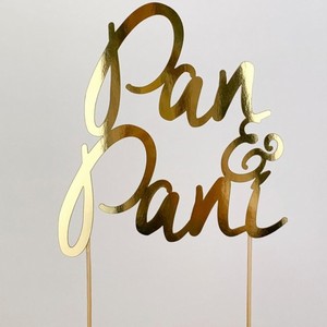 Zápich do svatebního dortu ve zlaté barvě tvoří nápis Pán a Paní