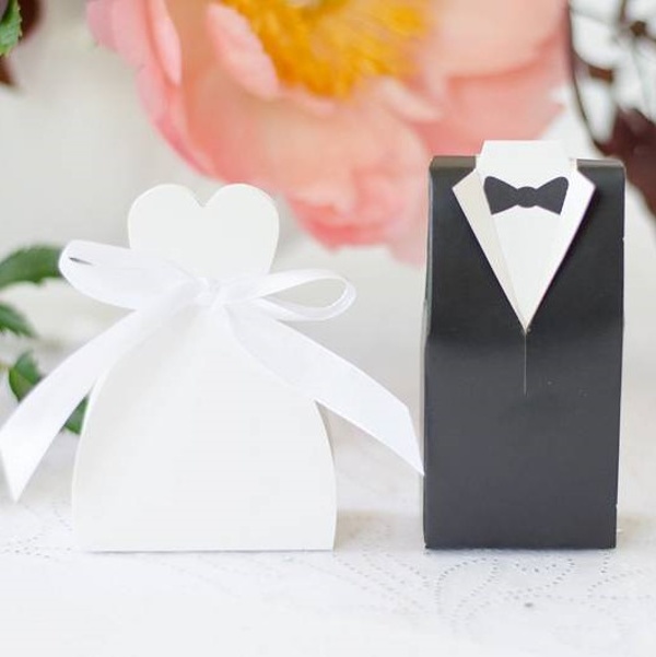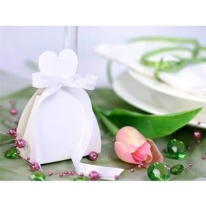 Dárkové krabičky v bílé barvě ve tvaru nevěsty s mašlí a srdíčkem