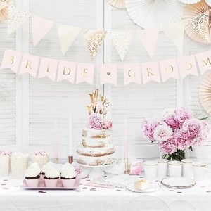 | Světle růžový papírový svatební banner se zlatým nápisem Bride-Groom. Délka girlandy je 1,55 m, výška vlaječek 15 … |