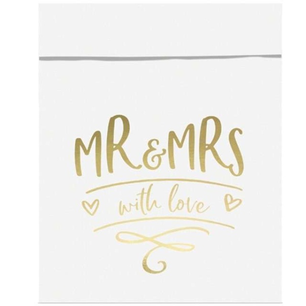 Papírový sáček v bílé barvě se zlatým nápisem Mr§Mrs na sladkosti je skvělá výzdoba a zároveň praktická pozornost.