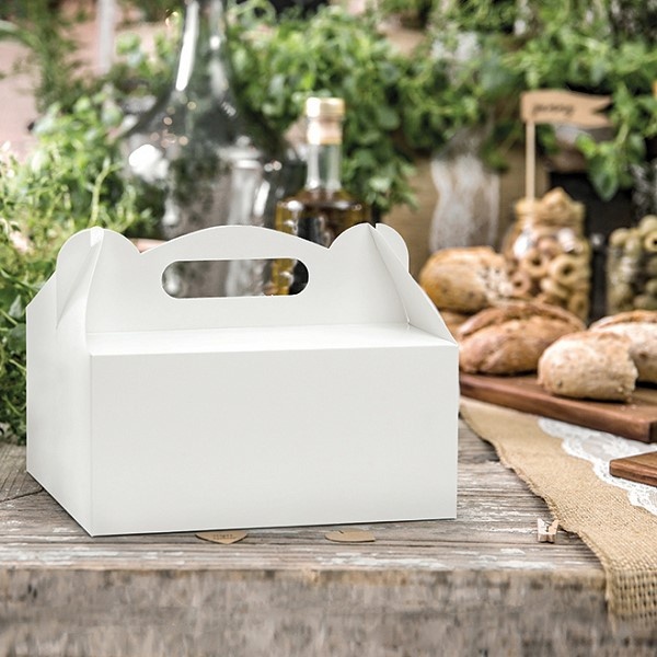Papírové krabičky na zákusky nebo svatební výslužku v bílé barvě by rozhodně na vaší oslavě neměly chybět.