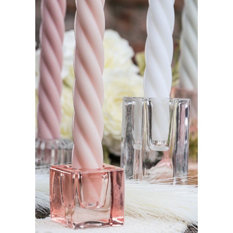 Elegantní růžový skleněný svícen ve tvaru krychle